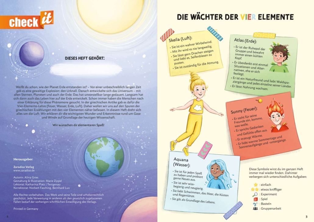 Die Mitmachbroschüre „Rund um die Luft – Die Kraft der vier Elemente“ aus der Reihe check it nimmt Kinder ab 9 Jahren mit auf eine spannende Entdeckungsreise. Zusammen mit Skeila, der Luft-Wächterin, erfahren sie, was Luft eigentlich ist, wie sie wirkt und warum sie so unverzichtbar für alles Leben auf der Erde ist.